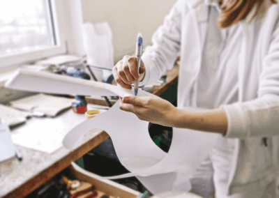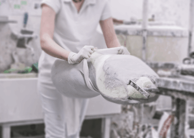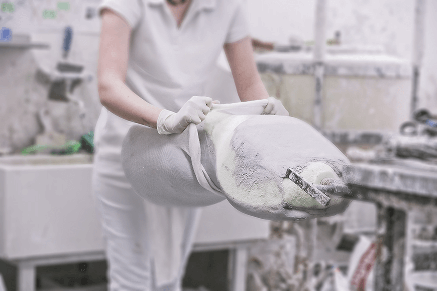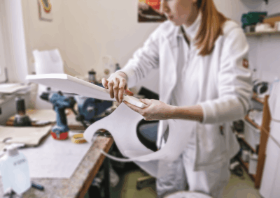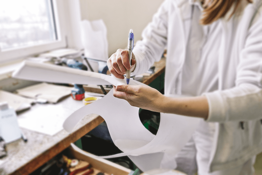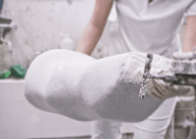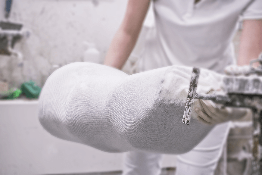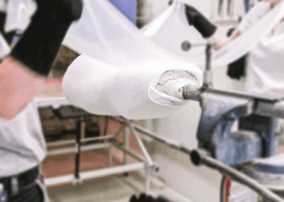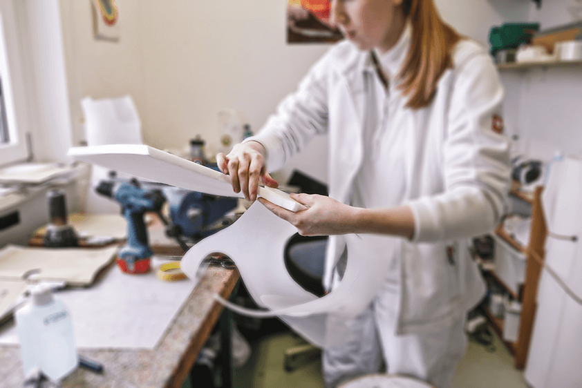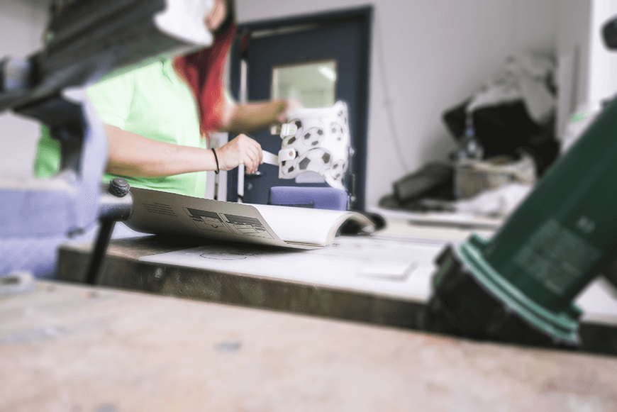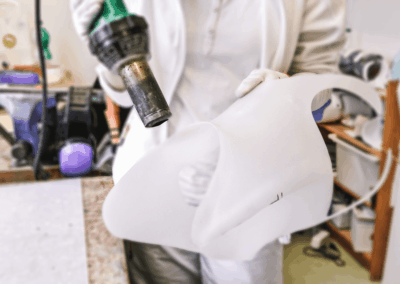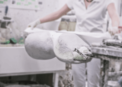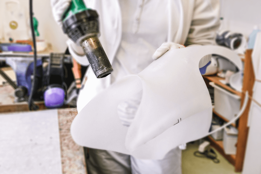 Nach Ihrem Besuch bei uns, werden Ihre Maße auf dem PC bearbeitet. Die Anfertigung des Korsetts findet mittels CAD CAM statt. CAD (Computer Aided Design) CAM (Computer Aided Manufacturing) bedeutet, dass nach Erfassung der Situation der Wirbelsäule, am PC ein virtueller Entwurf hergestellt und in Folge ein 3D-Modell gefräst wird. Im Anschluss wird dieses Modell tiefgezogen. Ausgangsstoff dabei ist eine Kunststoffplatte, welche bis zum Erweichungsbereich erwärmt und mittels Vakuum über das Modell gezogen wird. Durch das Anschmiegen des warmen Kunststoffes an das 3D-Modell, werden dessen Konturen abgebildet; anschließend wird das Kunststoffteil abgekühlt, sodass es formstabil bleibt und weiter verarbeitet werden kann.