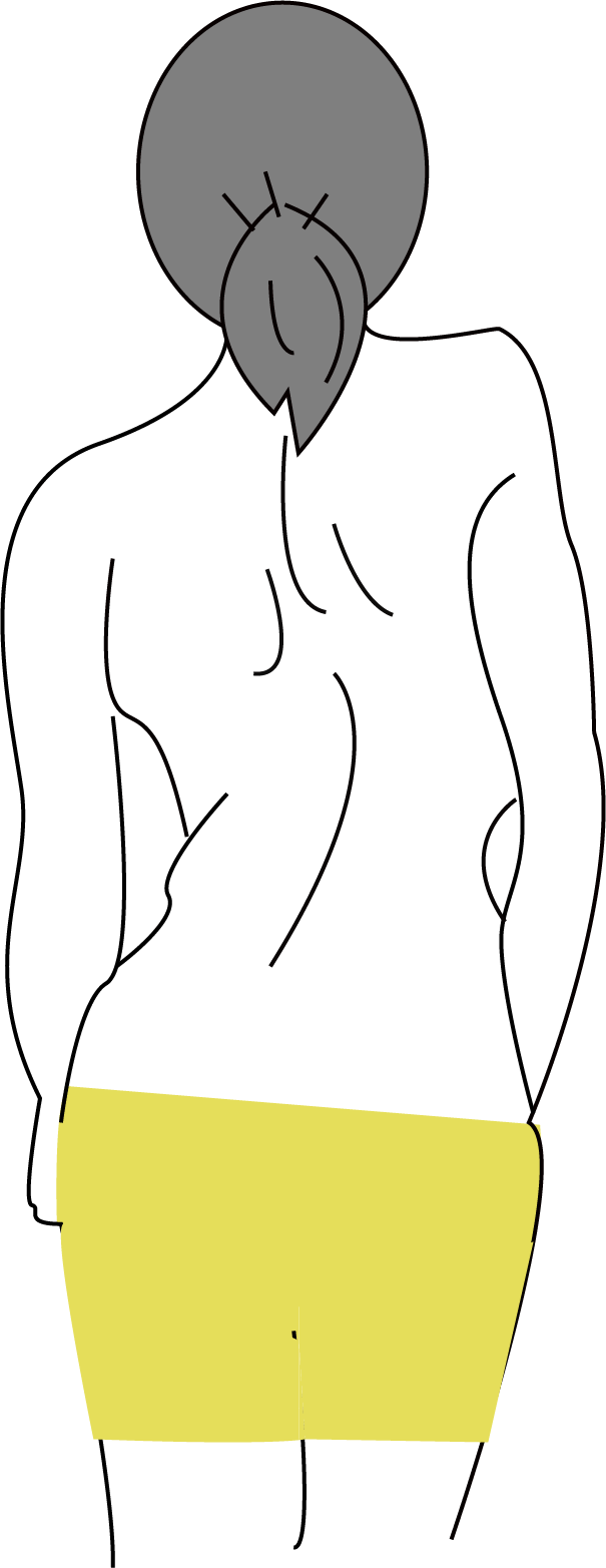 Der Kopf befindet sich nicht mittig über dem Becken, der Brustkorb ist asymmetrisch, der ganze Körper wirkt zu einer Seite geneigt.